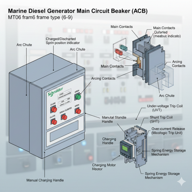 船舶发电机主开关(ACB)全解析:结构、原理与实操 在船舶电站中,发电机主开关(空气断路器,简称 ACB)是连…